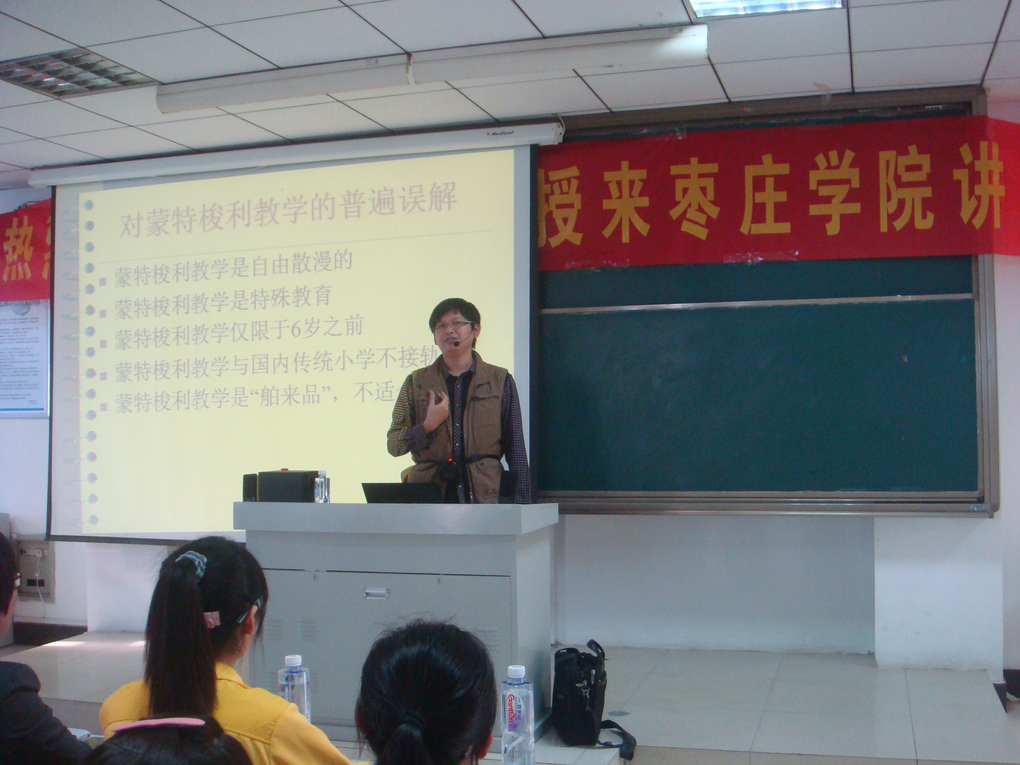 培训会上,庄芸萱教授以叩开蒙氏大门为主题展开讲座。她通过询问学生基本生活能力,言明了蒙氏教育的五大领域、四个能力与三个准备等教育内容。她着力于突出教育是“人的教育”这一核心本质,并结合当下幼儿教育现状,深刻地指出“5+2=0”教育模式的悲剧所在:习惯养成意识的缺失。随后,同行的Caco助讲则紧接蒙氏话题,从蒙台梭利医生背景的角度出发,借助照片展示、经历分享的形式,讲授了蒙氏教育“儿童尺寸”、“社区教育”、“混龄”的独特之处。活动全程氛围活跃,讲座期间不时爆发出热烈掌声。