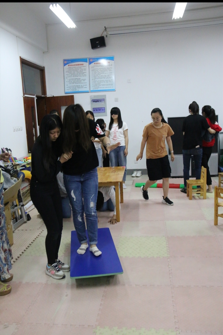 最后,靳昕带领大家走过了"成长之路”。同学们在感觉统和训练室两人扮演盲人与失语者相互配合、走过重重障碍,体验艰难的成长之路。