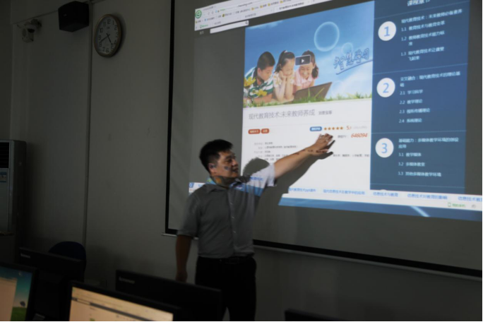 刘贵宝同志首先介绍了在线开放课程的建设思路,强调在线开放课程既要有静态学习资源,也要有动态教学过程,要让课程“活”起来。随后以《现代教育技术》课程为例,向大家演示了依托超星在线课程平台进行课程建设、资源发布、班级管理、活动组织和作业考试等活动的步骤和操作流程。教师们边听边练,积极研讨,气氛热烈。