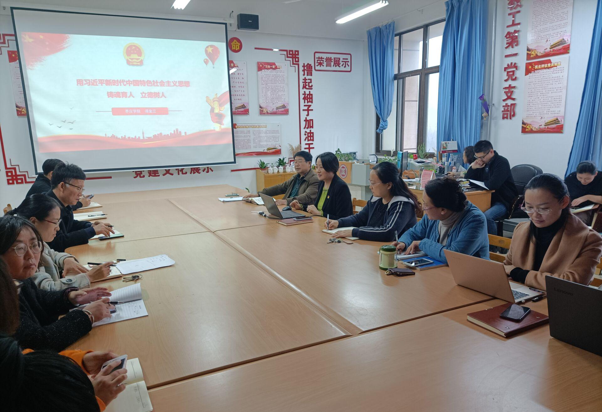 11月18日下午,我院院长傅金兰同志在资料室讲授了题为《用习近平新时代中国特色社会主义思想铸魂育人立德树人》的党课,党总支书记赵荣军主持,学院全体教师和部分学生代表参加学习。