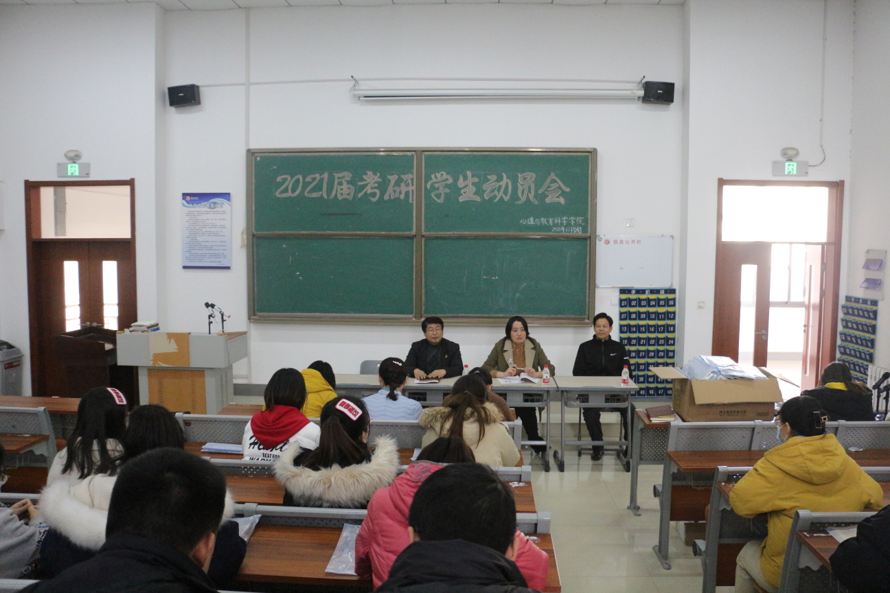 12月24日,tyc5997太阳集团在教师教育楼216室召开2021届考研学生动员会。会议由学院考研工作负责人刘贵宝主持,学院党总支书记赵荣军、院长傅金兰、党总支副书记宋明峰、考点带队老师及考研学生参加。