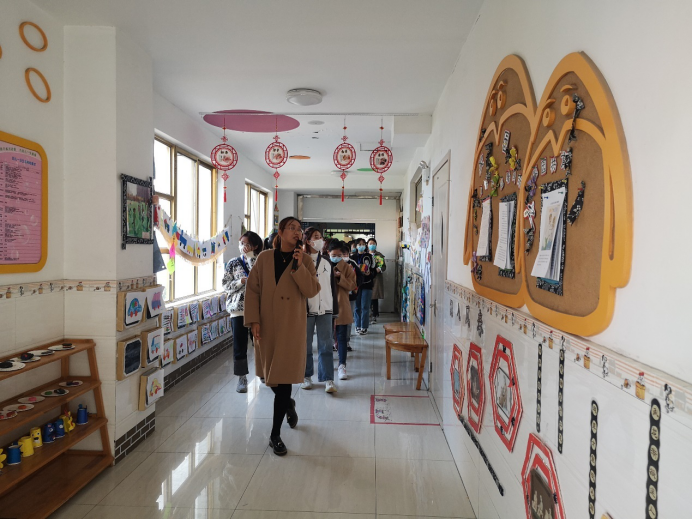 褚衍慧园长向见习生们介绍幼儿园的办园理念、师资力量、多彩活动等情况,见习生们参观了幼儿园室内外走廊、墙面、楼梯、户外活动场地等公共区域的环境布置。
