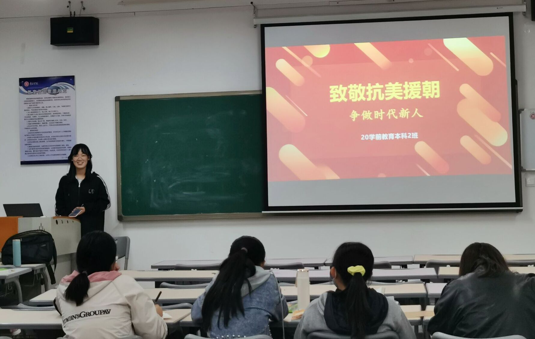 本次主题团日活动小学教育本科一班采取座谈分享形式开展,学前本科一班、学前本科二班采取演讲朗诵形式开展,学前专科一班采取微团课形式开展,各班同学积极参与。首先,各班负责人向同学们介绍了抗美援朝的历史背景、战争经过和中国志愿军取得抗美援朝战争的重要意义,重温了在抗美援朝战场上涌现的英雄事迹和艰苦卓绝的斗争,使同学们对革命先烈有了更进一步地了解,产生了更深的敬意。