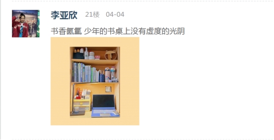 本次“最美书桌”活动已顺利拉下帷幕,一张小小书桌,倾注同学们静美岁月的书桌,折射出同学们在疫情期间乐观积极、认真努力的学习状态。一图载一心,同学们保持整理书桌的习惯,塑造整洁条理的学习环境,必能促使他们认认真真做好身边每一件事情。因此,本次活动也是一次润物细无声的德育行动,不仅促使同学们养成良好的生活和劳动习惯,也提升同学们的综合素质和生活能力。