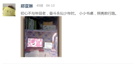 疫情防控期间,我院积极响应学校有关“停课不停学”的号召,开启“云课堂”在线授课模式,书桌已成为最忠实的陪伴者,也承载了一段静美时光。我院易班工作站在线大力宣传,本次“最美书桌”云之旅评比活动得到了学院同学们的积极响应。同学们通过易班APP扫码进入活动页面,阅读活动指引后在评论区展示自己书桌的照片并用文字讲述着书桌的故事。他们充分发挥自己的聪明才智和创造能力,用心“打扮”着属于自己的书桌。通过不同角度的拍摄,同学们将自己“书桌小天地”的精彩形象展现在我们眼前。在同学们上传的每一张照片之中,都展现出了同学们的品味喜好、生活习惯以及积极的学习态度,为在线教学的顺利开展奠定了良好的基础。最后,经过综合评选,十余名同学获得此次“最美书桌”活动的奖项。