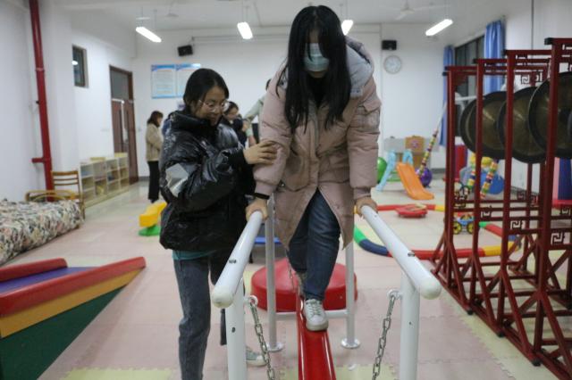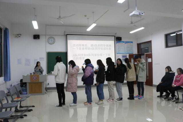 在感统训练室,同学们分角色扮演失语者和盲人,同伴之间相互扶持越过障碍,携手走过了“成长之路”。这个过程帮助同学们体验对朋友、伙伴的信任与感恩。