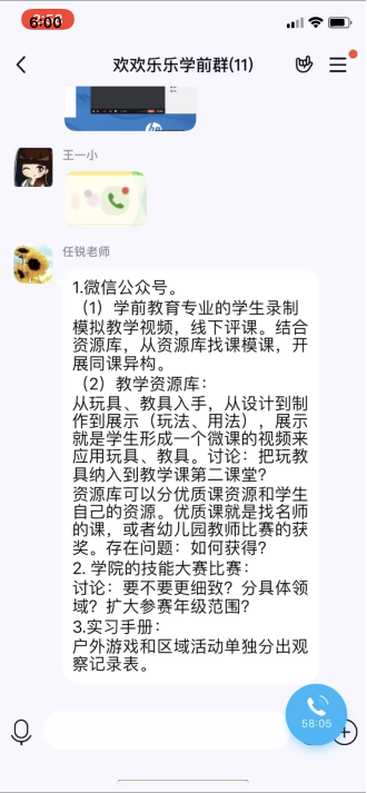 会议第二阶段,徐文娟为老师们分享了枣院儿童剧公众号创立与维护的宝贵经验;联系专业认证中学生教学实践能力养成的要求,老师们开启头脑风暴模式,讨论并总结出学前教育专业师范生职业能力养成第二课堂工作思路。朱梅、王一小、韩茜、孙齐、李睿彤、孙逊六位老师分别分享了家庭教育、钢琴弹唱、玩教具、美术、教学法第二课堂网络平台的初步意向。