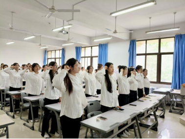 入团仪式在庄严的国歌声中拉开帷幕,学院团委书记张玉洁宣读新发展团员名单,老团员为新团员颁发团员证、佩戴团徽。2023级心理学本科1班张蕊同学作为领誓人,带领全体新团员面向团旗庄严宣誓,铿锵誓言响彻会场,彰显了共青团员矢志不渝听党话、跟党走的坚定信念。新团员代表、2021级学前教育专科4班孔潇悦表示:“加入中国共产主义青年团不仅是一份荣誉,更是一份责任。我们将以优秀前辈为榜样,在专业学习与实践中锤炼本领。”优秀团员代表、2022级心理学本科1班刘海昀则结合自身经历,鼓励新团员在科技创新与社会服务中发挥青年力量,让奋斗成为青春最亮丽的底色。