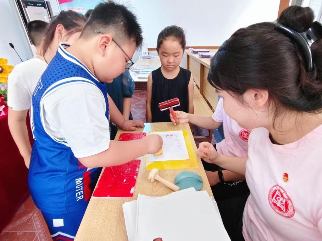 非遗润童心,志愿传薪火。在沙沟镇村委会,队员们充分发挥专业优势,开展了一系列非遗美育课程。漆扇制作课上,孩子们在志愿者指导下,用画笔在扇面上勾勒出绚丽图案,感受传统漆艺魅力;雕版拓印课程中,孩子们亲手触摸古老雕版,体验拓印过程,见证传统文化的神奇;绒花扭扭棒课程充满创意,孩子们发挥想象力,制作出形态各异的绒花作品;绘本阅读活动中,志愿者们精心挑选了如《中国传统节日》等经典绘本,用生动的语言、丰富的表情和形象的动作,将绘本中的故事活灵活现地展现给孩子们;手语教学活动中,志愿者们从基础的手语教起,耐心地一个动作一个动作示范,比如 “你好”“谢谢”“再见” 等日常用语的手语表达。