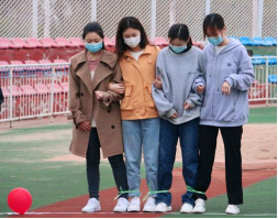 第三项“心心相印(背夹球)”,每组2人,背夹一气球,步调一致向前走。该游戏旨在提高学员间的默契度,培养学员相互关爱、相互信任的优良品格。