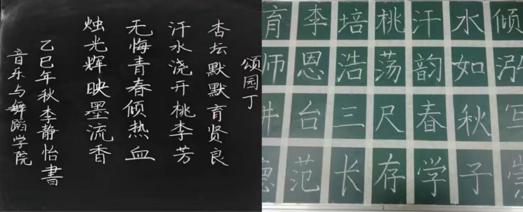 本次活动以“致敬师者”为核心,聚焦师范类专业学生,同时广邀非师范类专业学生共赴笔墨之约。活动启动后,各学院学子踊跃投稿,参赛作品紧扣主题、风格多元:或笔力千钧、气势磅礴,或刚劲有力、气韵生动,于方寸黑板间尽显扎实书写功底与人文情怀。