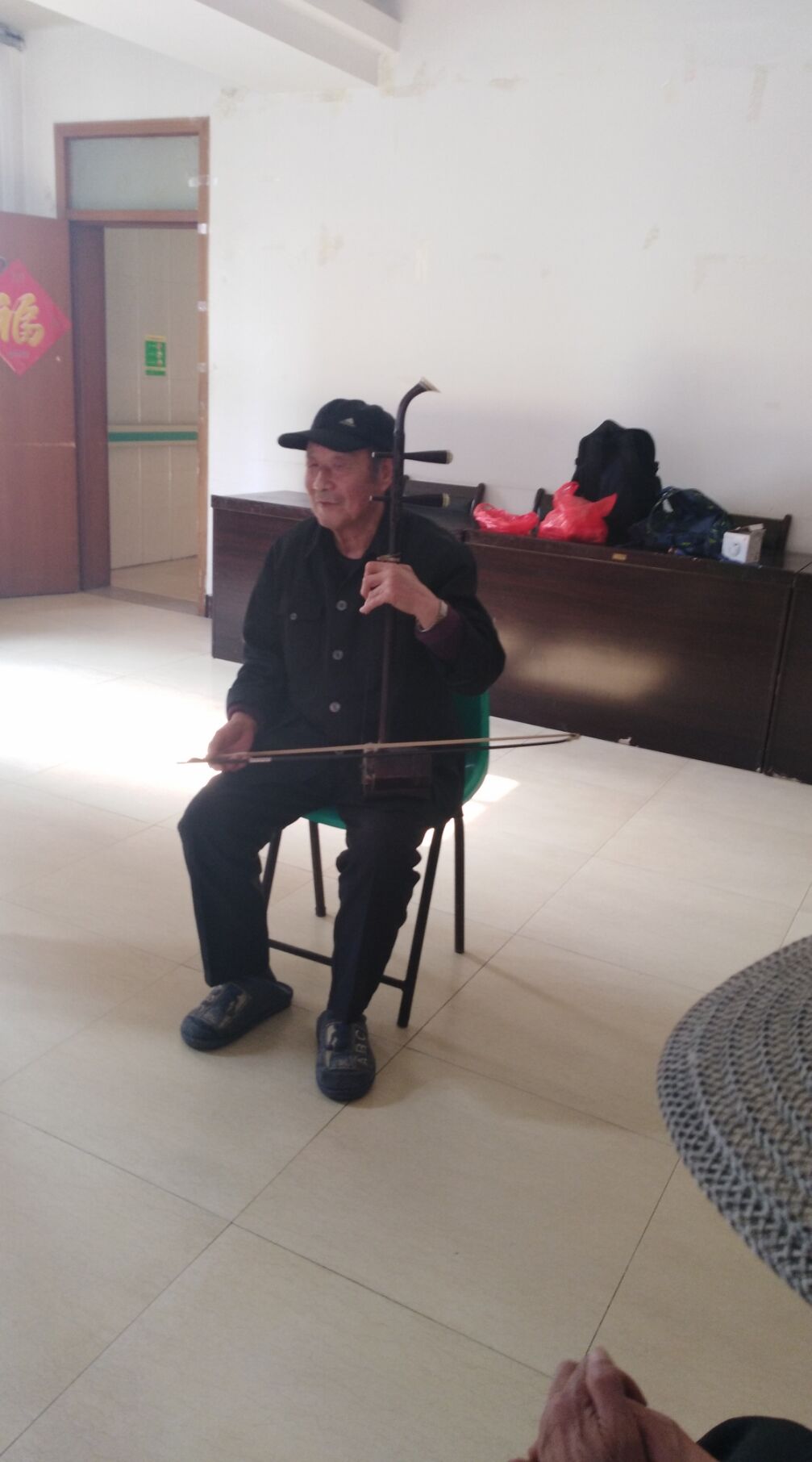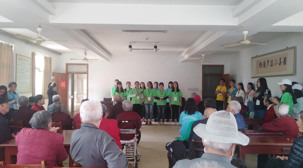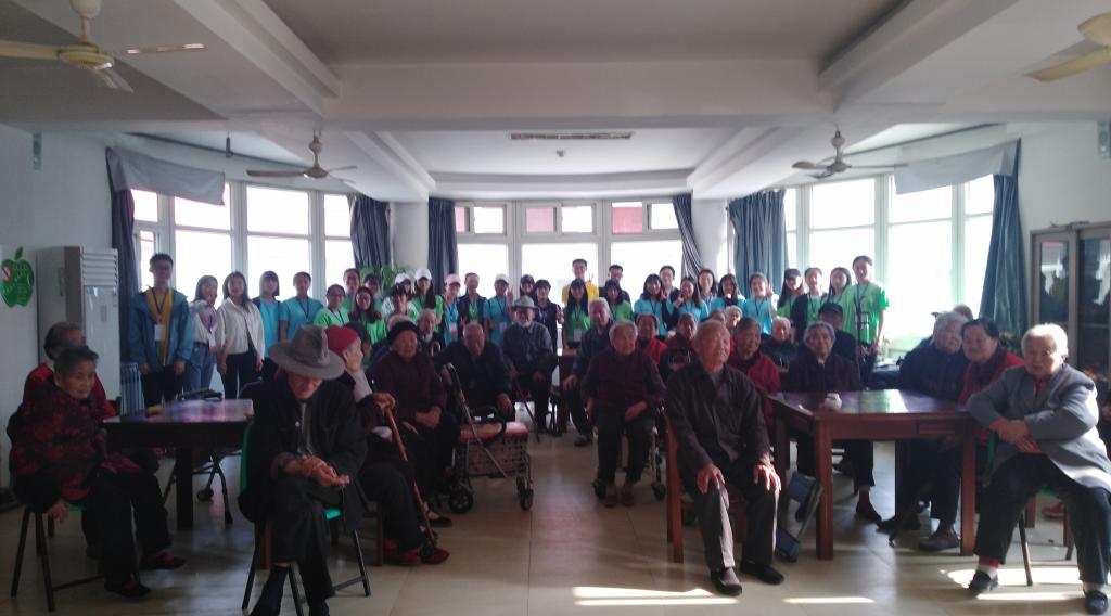 接着,穿插了“奏乐传香蕉”的小游戏,音乐停止香蕉在谁手里谁就表演节目,老人们通过游戏找回了童年时的快乐。老人们被志愿者们青春的热情感染了,自发的表演了舞蹈、红歌汇《军中绿花》、《毛主席的书》等经典老歌、二胡演奏《社会主义好》等。最后合影留念,彼此表达了依依不舍之情。