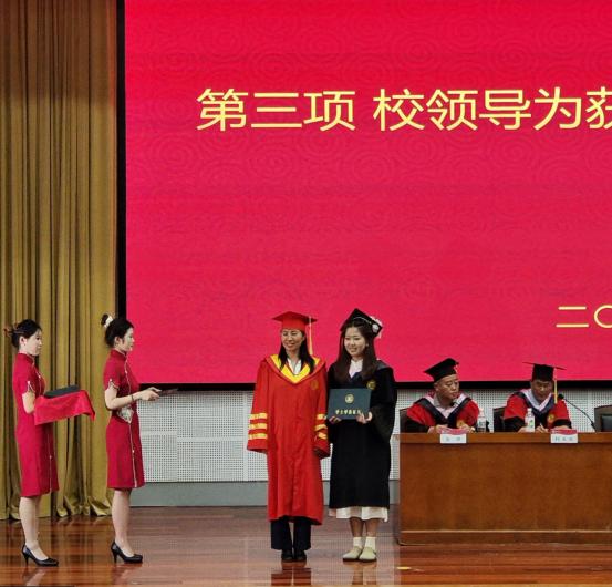 典礼前,毕业生一同观看了毕业纪念视频致敬大学时光。典礼在庄严的国歌声中拉开帷幕,家国情怀与青春热忱交融,开启这场关于成长与离别的仪式。院长傅金兰宣读了《关于授予2025届毕业生学士学位的决定》,褚夫敏依次为毕业生拨穗正冠、颁发学士学位证书,党委副书记姜周为2025届校友联络员代表颁发聘书。