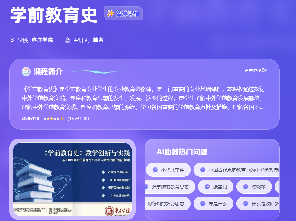 《学前教育史》课程的“人工智能赋能教学改革”数智化改革依托超星平台推进教学改革的过程中注重突出以学生为中心的产出导向,重视学生的课堂参与深度,通过建设线上教学资源、教学环境、“活化”课程评价等赋能学生学习全过程管理,以技术赋能为手段培养学生的职业情感与职业信念。